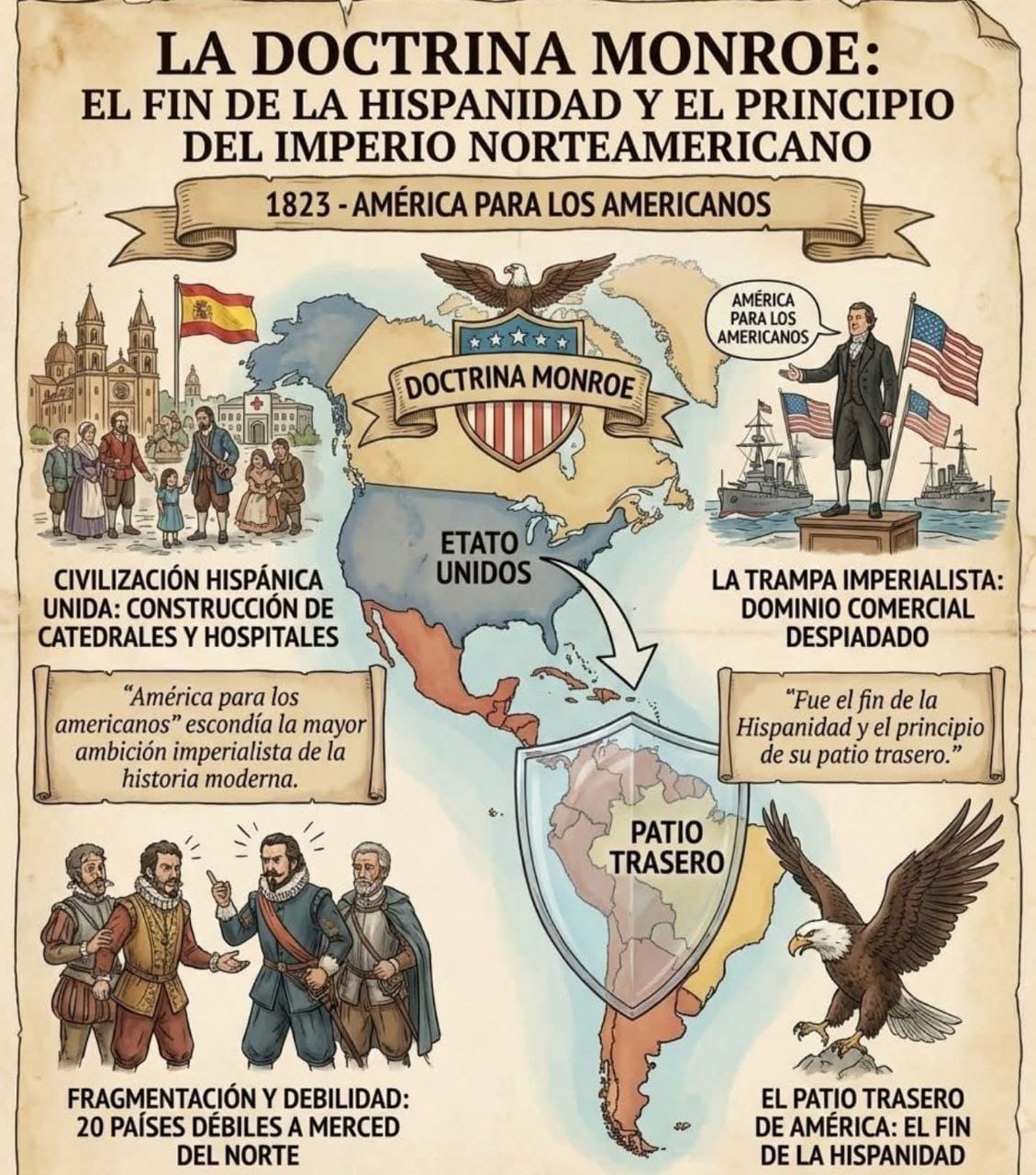 Es una curiosa ampliación de la Doctrina Monroe que abre muchos campos a la sespeculaci´ón y espectativas futuras y una pregunta inquietante: ¿Donde esta España ahora? Esa España que hoy anda sobre la historia como pollo sin cabeza, ¿Cuando va a asumir su papel de madre de naciones y esperanza de pueblos? ¿Cuando va a recobrar su identidad? ¿Cuando va a despertar?.