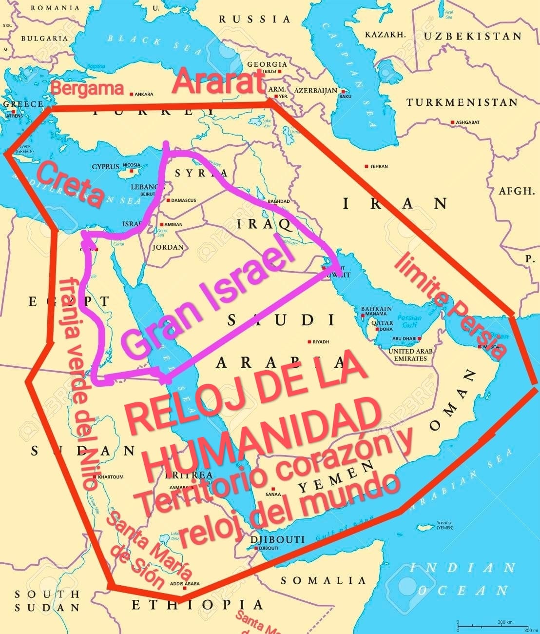 En el dibujo de abajo se aprecia ese Gran Israel dentro de un territorio mucho más amplio. No tiene nada que ver con las intenciones de ningún beligerante actual. Es la zona que podemos considerar como el CORAZÓN DE LA TIERRA (CT) y RELOJ DE LA HUMANIDAD (RH). Es la tierra comprendida entre Ararat- Limite de la antigua Persia- Santa Maria de Sión- Franja verde del Nilo y Creta.